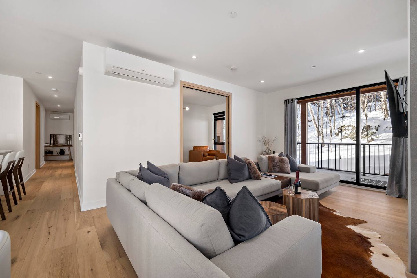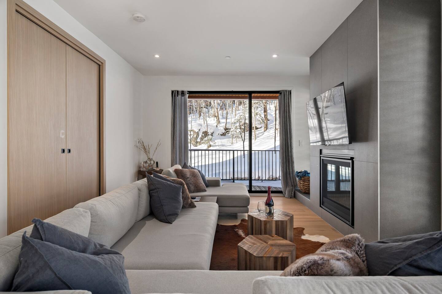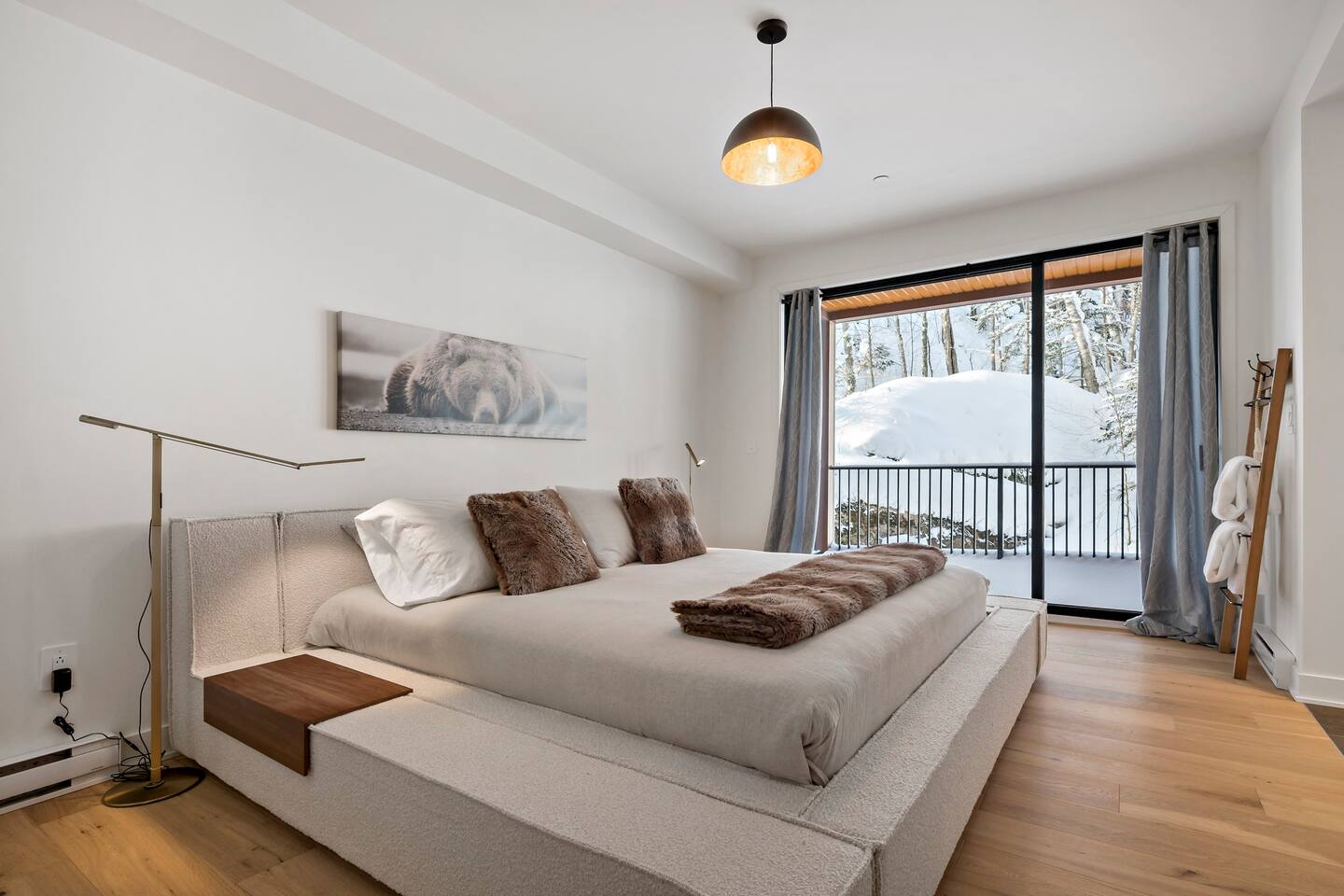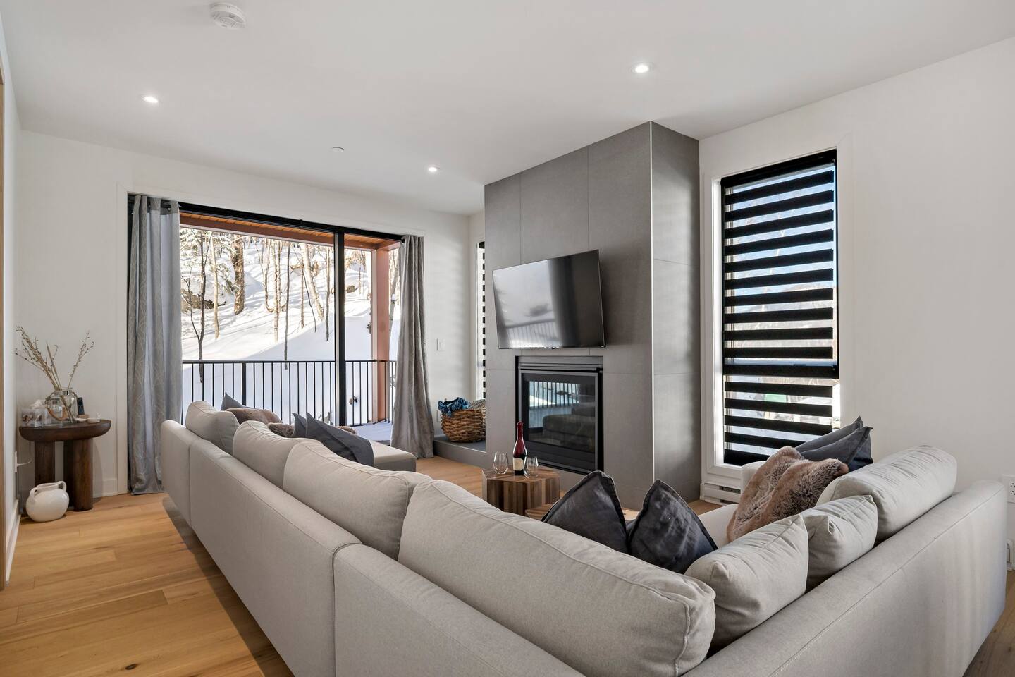 Escape to this stunning 3-bedroom luxury condo just steps from the Versant Soleil chairlift! Perfect for families/groups, this modern retreat offers breathtaking views, a cozy living area with a fireplace, and a fully equipped kitchen. Enjoy access to the Algonquin trail (#39), ski storage, free indoor parking with an electric car charger, and a large balcony to enjoy the scenery. Close to restaurants, shops, and outdoor activities, this is the ultimate spot for your Mont-Tremblant adventure! The Space - Bedroom 1: King-size bed with an ensuite bathroom that has heated floors - Bedroom 2: King-size bed - Bedroom 3: Murphy bed that can be converted into a desk/bookcase or bed. *Please let us know in advance if you would like...
