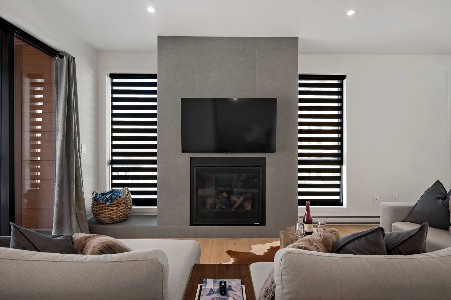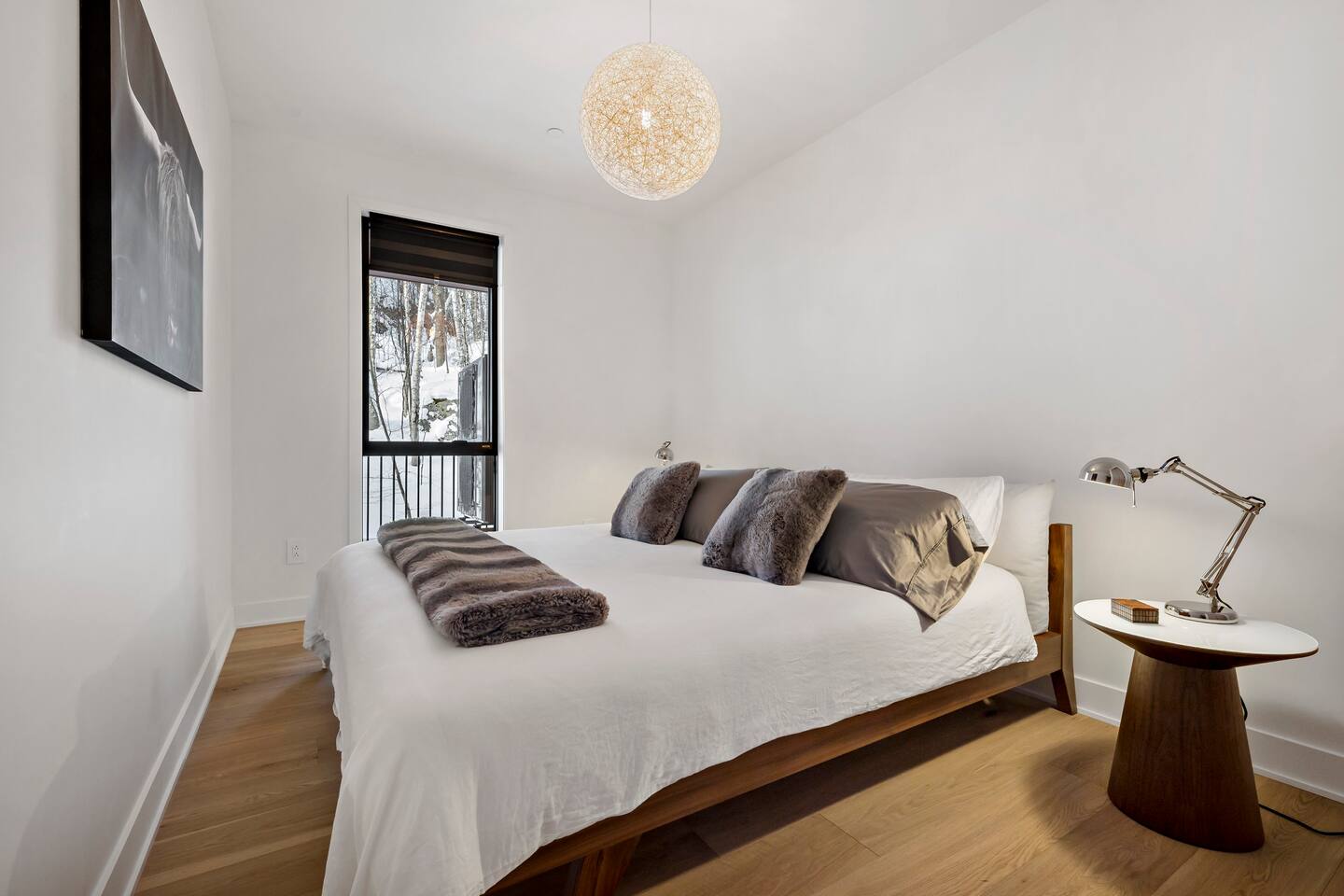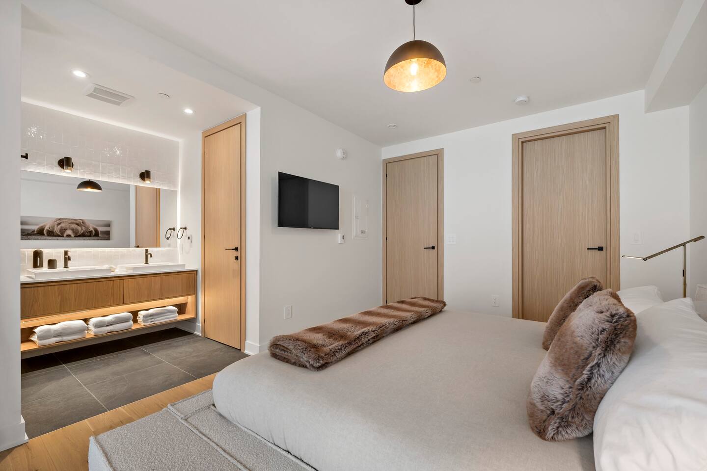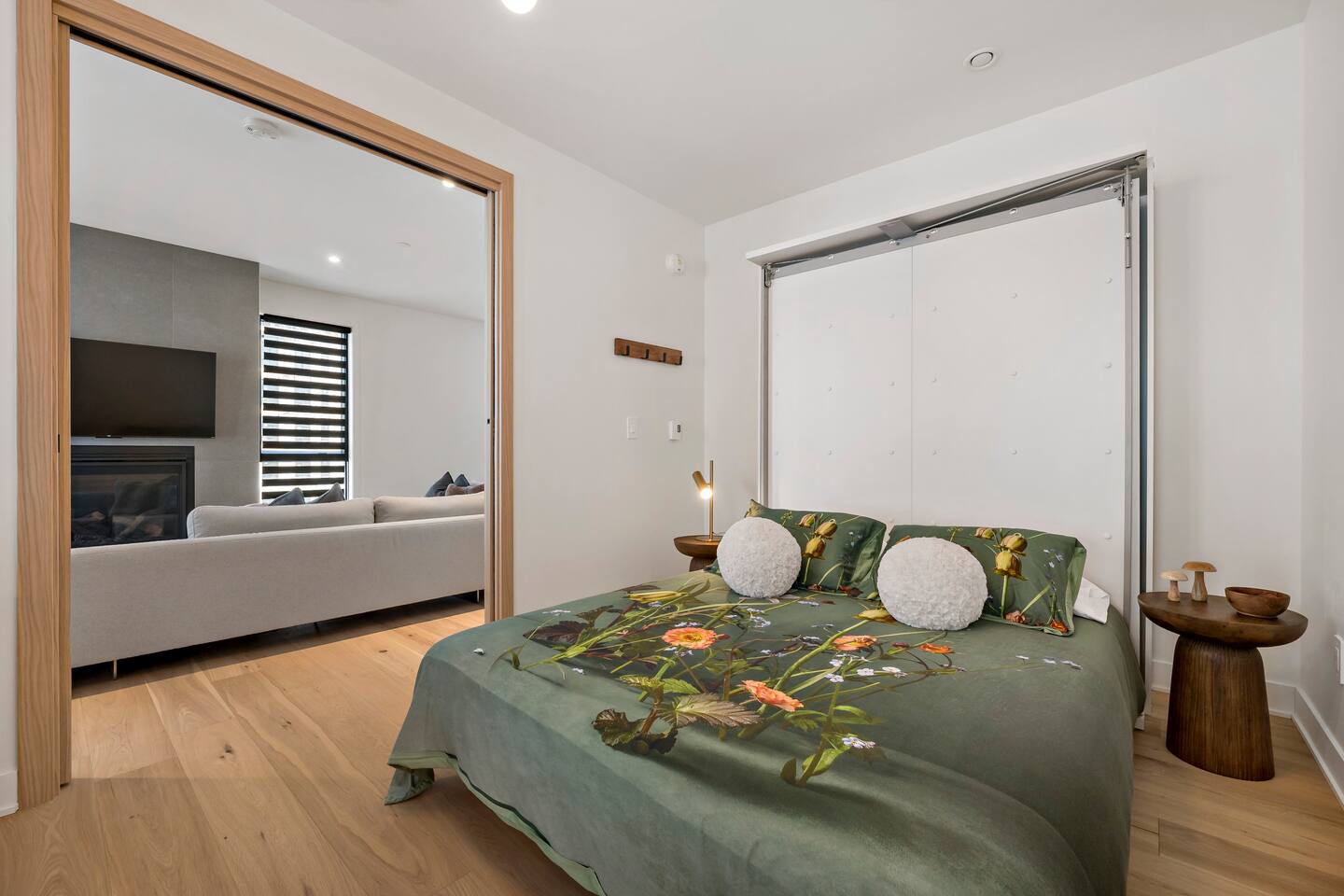 Escape to this stunning 3-bedroom luxury condo just steps from the Versant Soleil chairlift! Perfect for families/groups, this modern retreat offers breathtaking views, a cozy living area with a fireplace, and a fully equipped kitchen. Enjoy access to the Algonquin trail (#39), ski storage, free indoor parking with an electric car charger, and a large balcony to enjoy the scenery. Close to restaurants, shops, and outdoor activities, this is the ultimate spot for your Mont-Tremblant adventure! The Space - Bedroom 1: King-size bed with an ensuite bathroom that has heated floors - Bedroom 2: King-size bed - Bedroom 3: Murphy bed that can be converted into a desk/bookcase or bed. *Please let us know in advance if you would like...