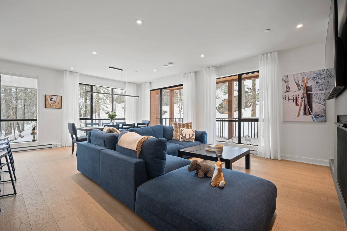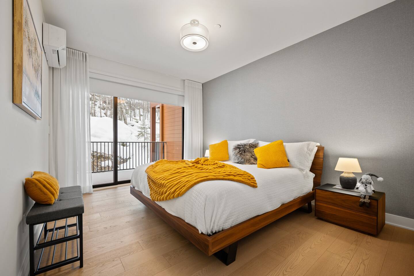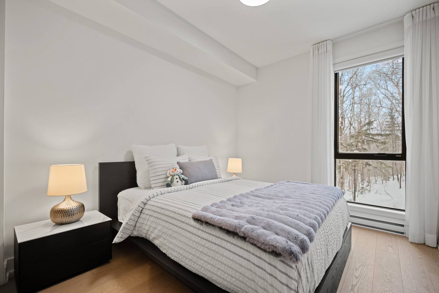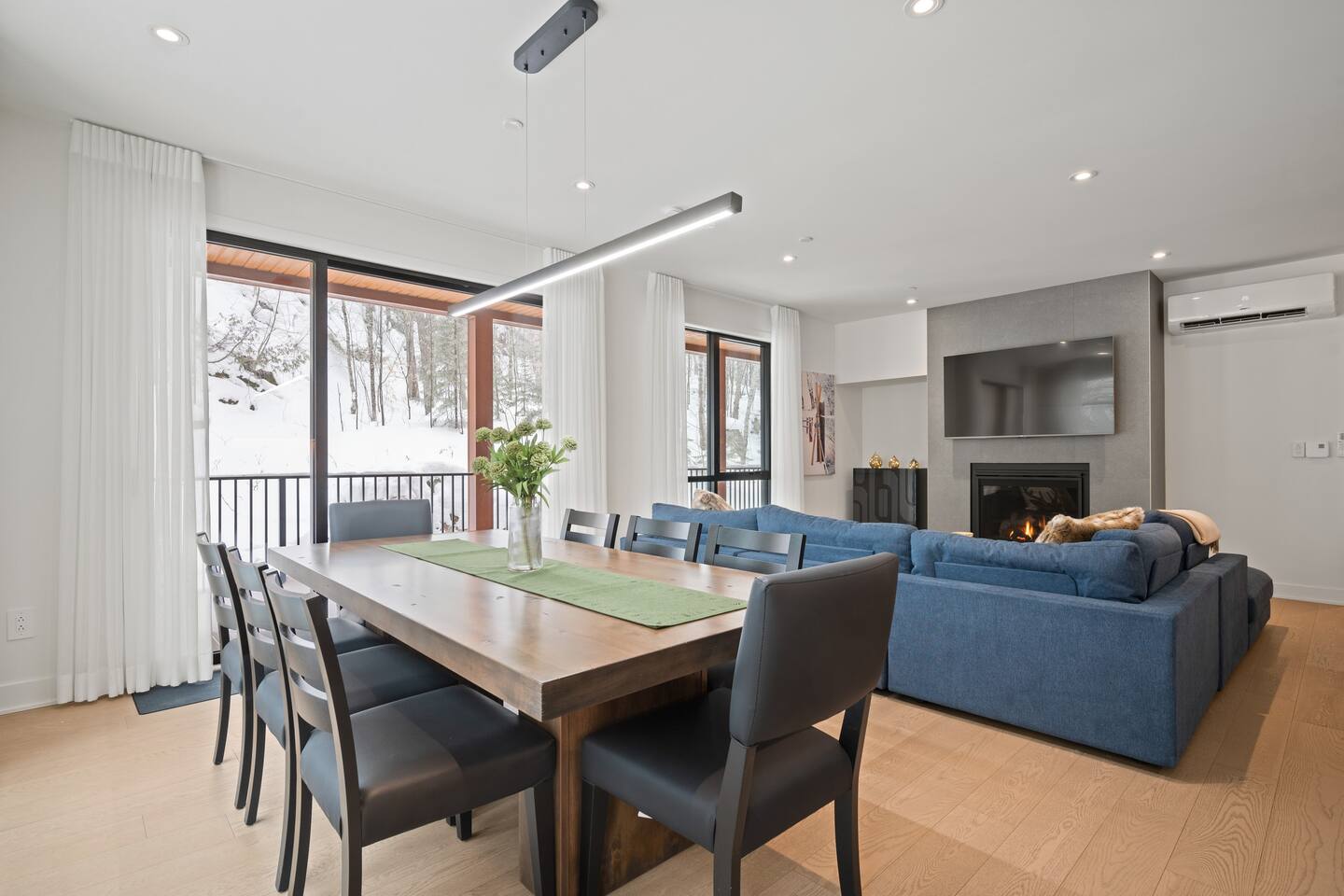 Escape to this stunning 3-bedroom luxury condo, thoughtfully designed to accommodate up to 10 guests. Just steps from the Versant Soleil chairlift, this modern retreat features a cozy living area with a fireplace, a fully equipped kitchen, and breathtaking views. Enjoy direct access to the Algonquin Trail (#39), ski storage, free indoor parking spot with an EV charger, and a spacious balcony. Conveniently near restaurants, shops, and outdoor activities, it’s the perfect Mont-Tremblant getaway!  The Space: - Bedroom 1: King-size bed with an ensuite bathroom that has heated floors  - Bedroom 2: Two queen beds  - Bedroom 3: Queen bed  - Couch: Can comfortably sleep 2 people (we have extra blankets and pillows)  - Bathrooms: Two full bathrooms, including a...