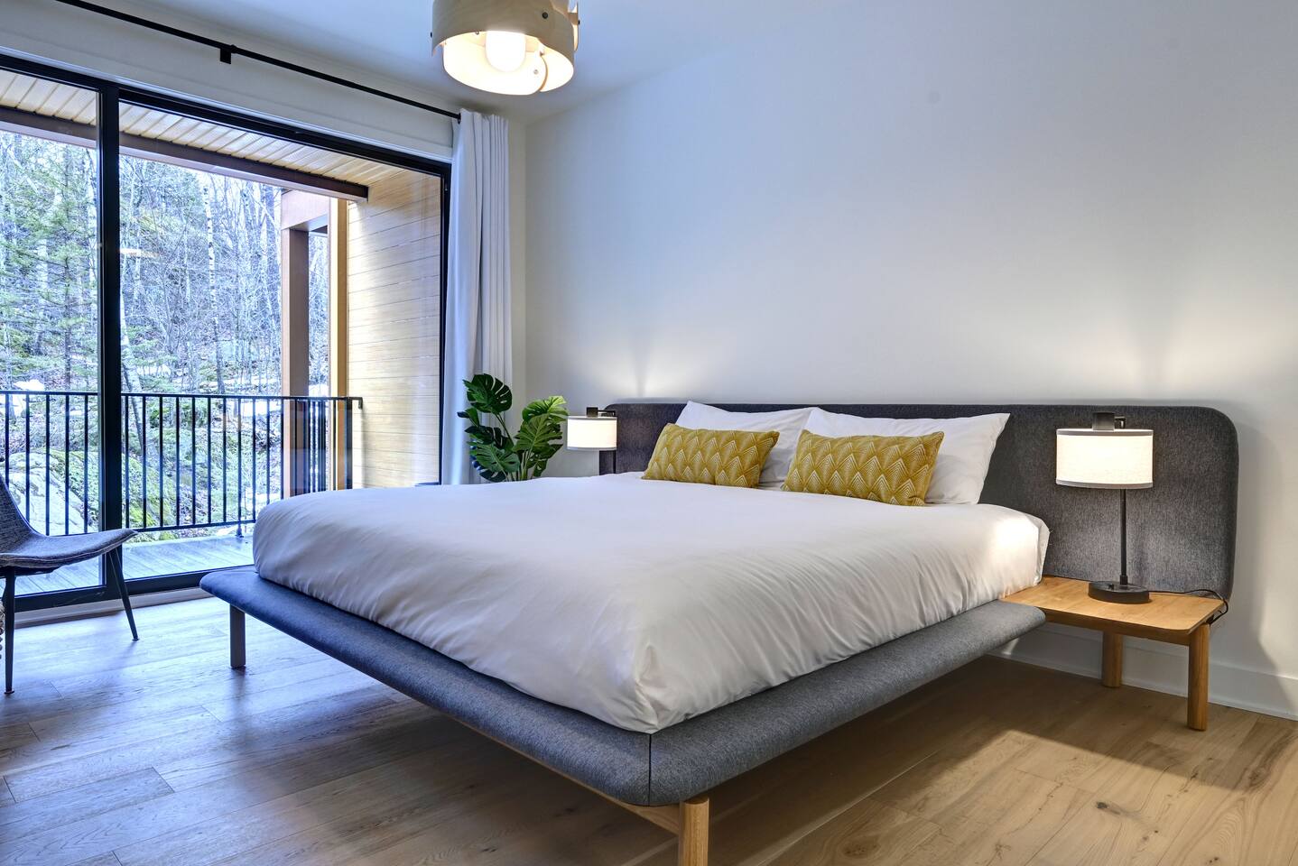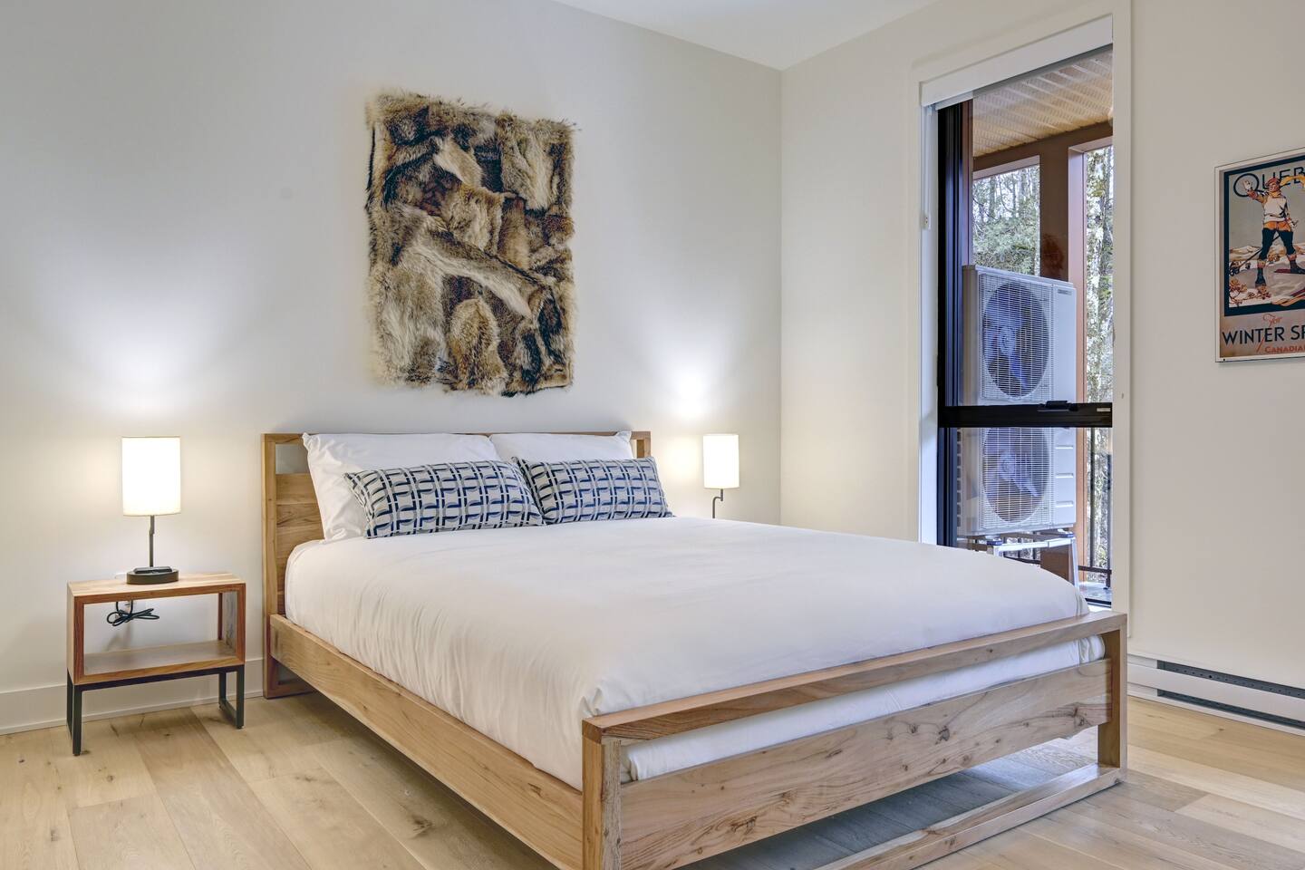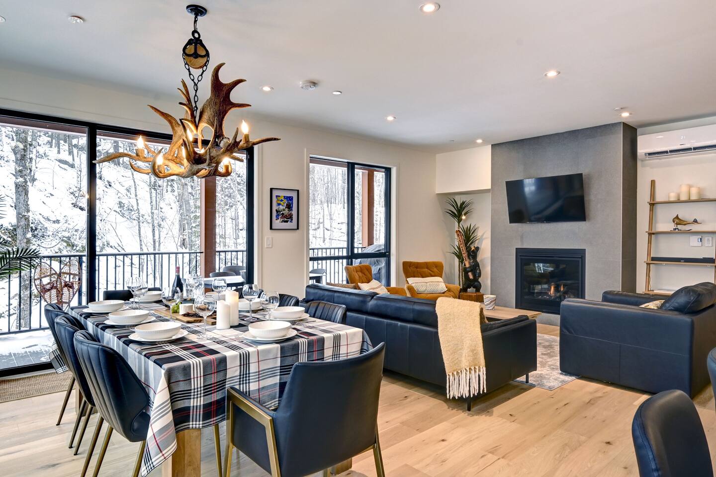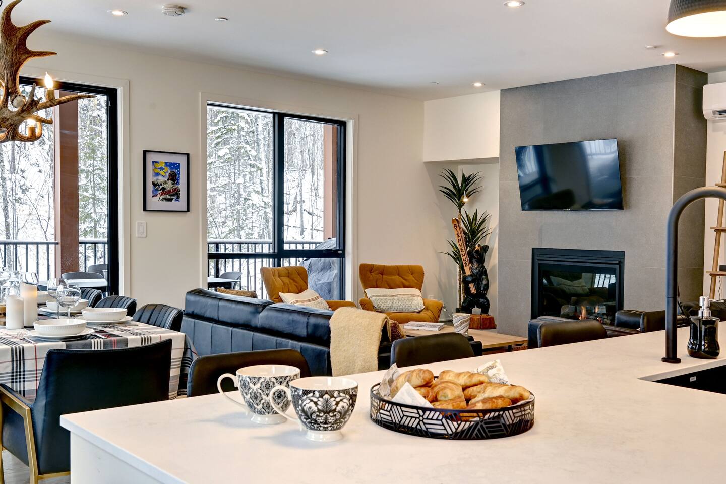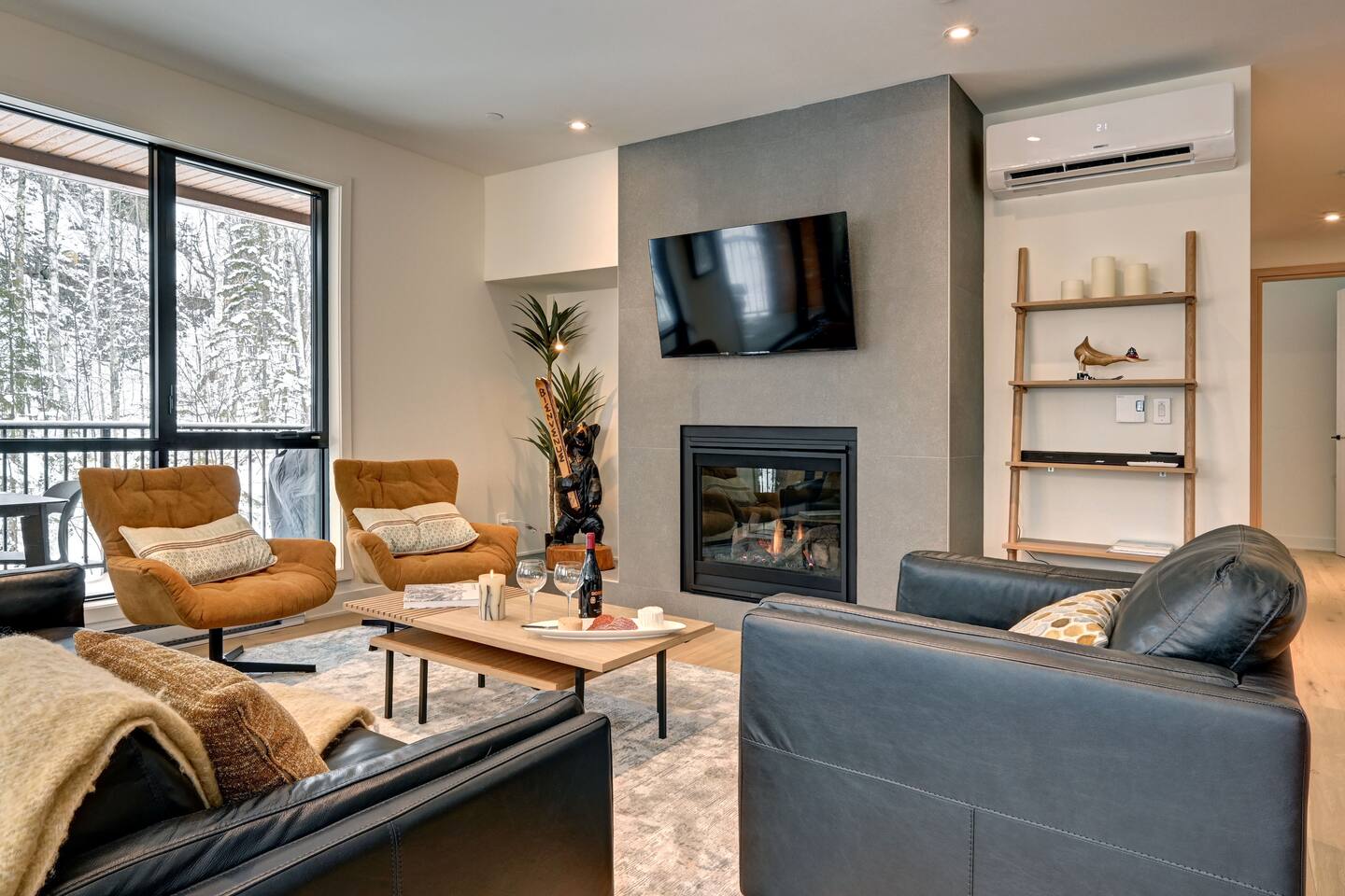 Escape to this spacious, luxurious new condo on Tremblant's Versant Soleil. A 7-minute walk from the Algonquin green ski trail. Direct access (20 meters) to the Nord-Sud hiking, mountain biking and alpine trail. This condo is located near the Casino, Golf Le Géant and Golf Le Diable. Just a 5-minute drive away, enjoy Tremblant's pedestrian village with its restaurants and boutiques. Spend your stay in a bright, modern space, fully equipped to relax in top-of-the-range comfort. The space - Bedroom 1: King-size bed with an ensuite bathroom that has heated floors- Bedroom 2: Queen-size bed- Bedroom 3: Bunk-bed with 2 singles and 1 double- Bathrooms: Two full bathrooms, including a master en-suite with heated floors, providing ample space to refresh...