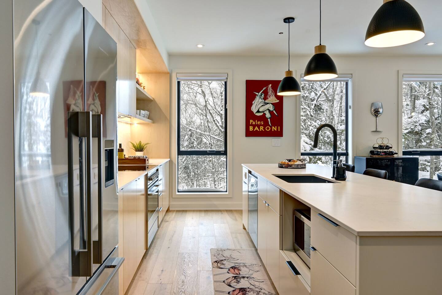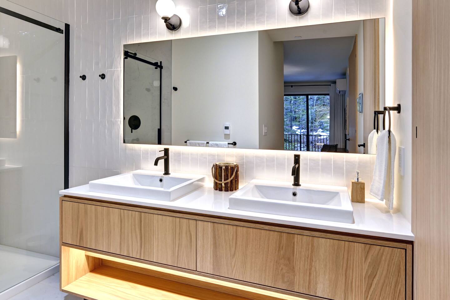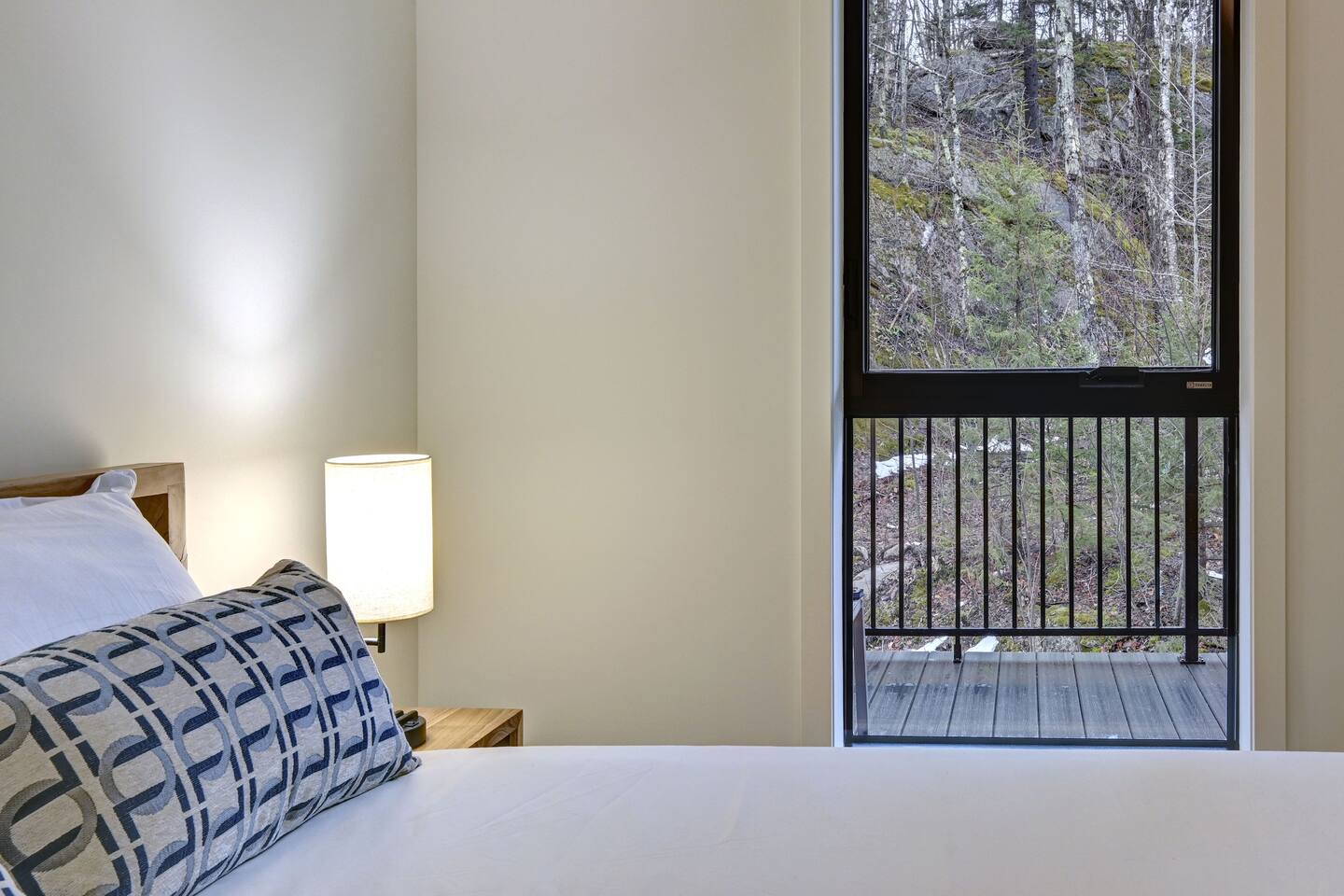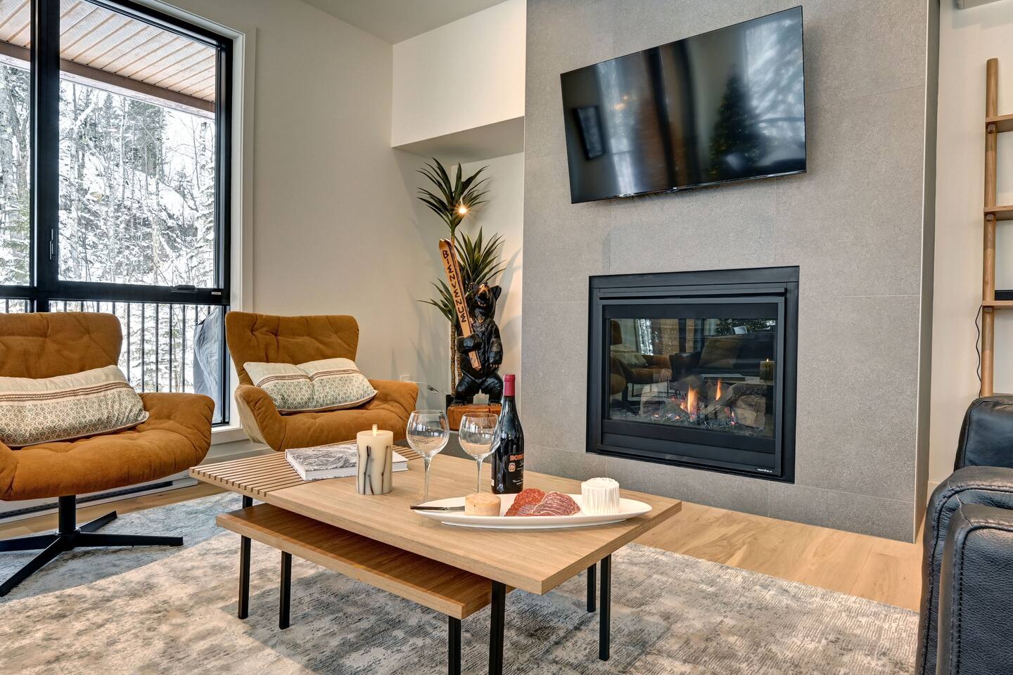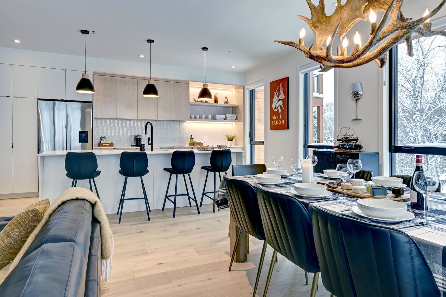 Escape to this spacious, luxurious new condo on Tremblant's Versant Soleil. A 7-minute walk from the Algonquin green ski trail. Direct access (20 meters) to the Nord-Sud hiking, mountain biking and alpine trail. This condo is located near the Casino, Golf Le Géant and Golf Le Diable. Just a 5-minute drive away, enjoy Tremblant's pedestrian village with its restaurants and boutiques. Spend your stay in a bright, modern space, fully equipped to relax in top-of-the-range comfort. The space - Bedroom 1: King-size bed with an ensuite bathroom that has heated floors- Bedroom 2: Queen-size bed- Bedroom 3: Bunk-bed with 2 singles and 1 double- Bathrooms: Two full bathrooms, including a master en-suite with heated floors, providing ample space to refresh...