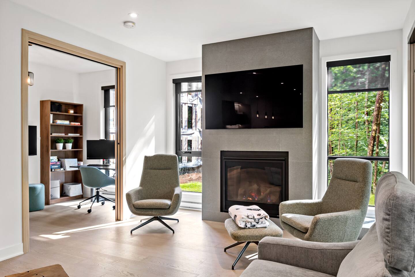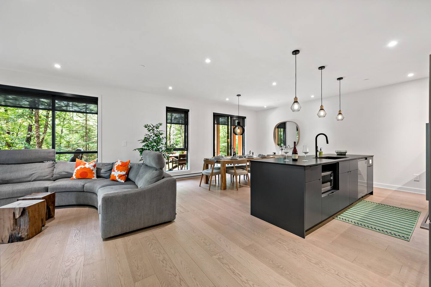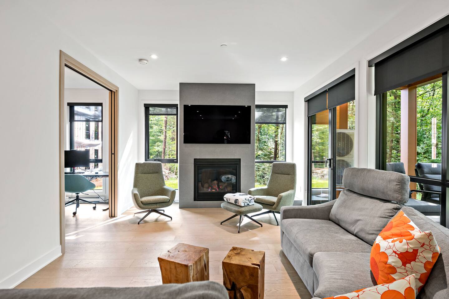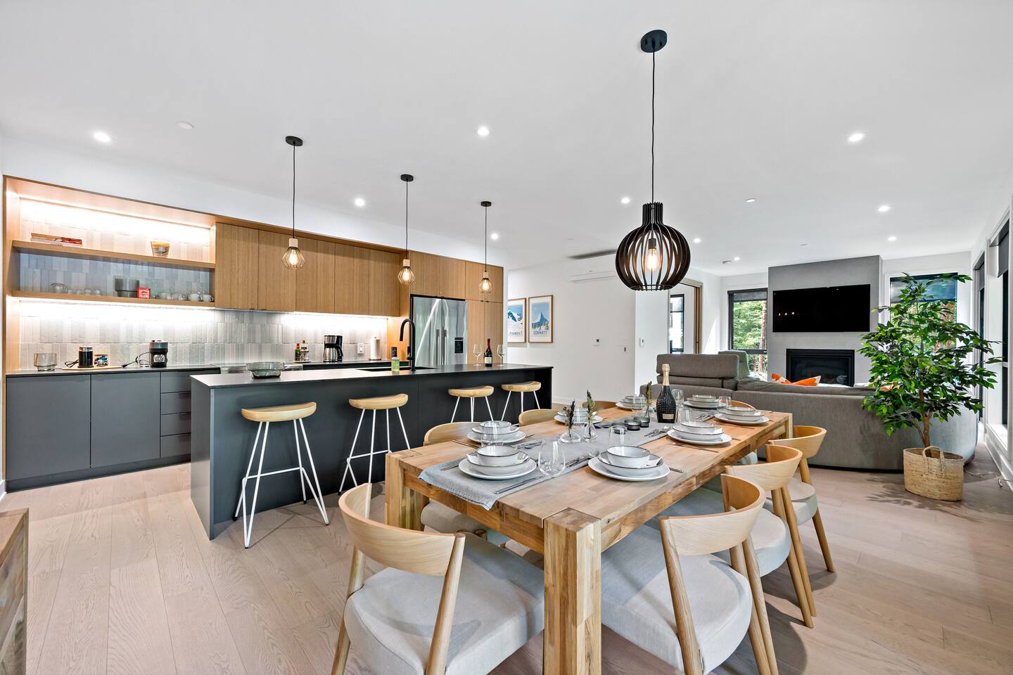 Escape to this stunning luxury condo, designed for up to 8 guests and ideal for a Tremblant retreat. With beach access included, you are just steps from hiking trails, this modern forest getaway offers direct access to hiking, biking, and breathtaking scenery. Relax in the cozy living area with a fireplace, cook in the fully equipped kitchen, or unwind on the spacious balcony with serene views. Includes storage, free parking with EV charger, proximity to restaurants, shops, the Casino and golf!